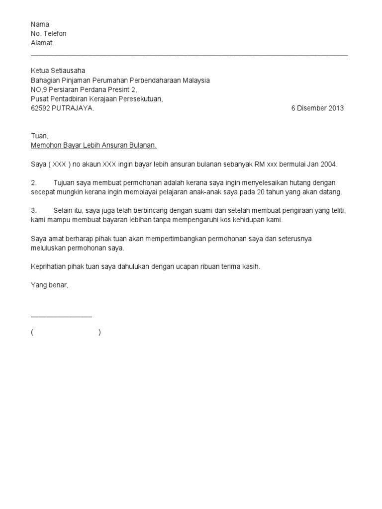 contoh surat bayaran separuh pinjaman